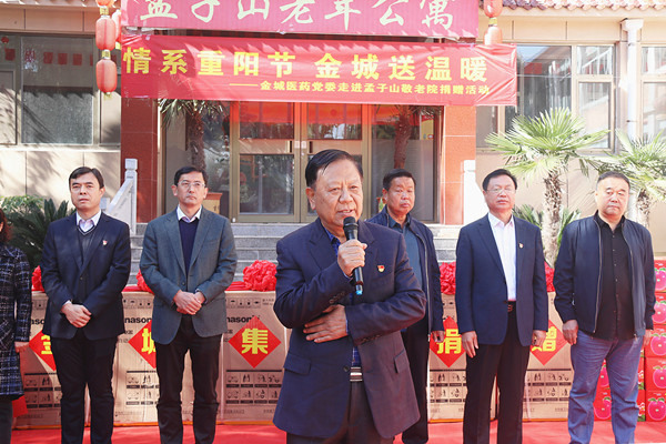 在捐贈儀式上,金城醫藥黨委書記、金城集團董事長趙鴻富為老人們送上了熱情洋溢的節日祝福。他說,重陽節到了,我代表金城醫藥黨委來看望大家,關心關愛老人也是我們的職責,公司這些年發展了,規模擴大了,品牌影響力提升了,這都得益于各級黨委政府和西河鎮家鄉父老的支持,公寓內有好多老人都曾經是金城公司的老員工,是你們給公司打下了堅實的發展基礎,你們是前輩、是基石,沒有你們的付出就沒有金城公司的今天。今天,在重陽節到來之際,我和集團黨委的幾位同志帶著一份敬意和心意來看望大家,希望老人和前輩們在這里能夠穿得住得干干凈凈、生活舒舒心心,安享晚年。公司也將繼續一如既往地關心支持敬老院的發展,盡公司最大能力向老人敬獻一份愛心。